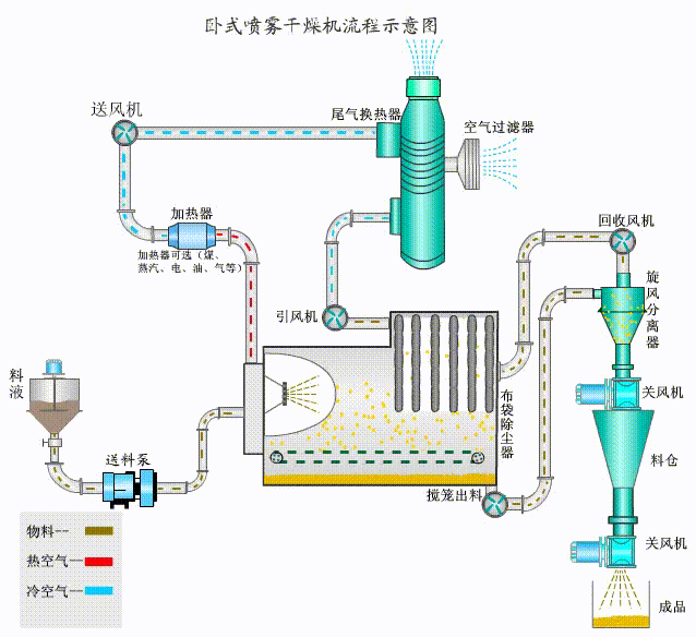 臥式噴霧干燥塔工作原理通常為:前處理生產(chǎn)形成的漿料,通過高壓泵加壓均質(zhì)從噴霧干燥塔上方的噴嘴霧化,與此同時(shí)利用進(jìn)風(fēng)機(jī)和排風(fēng)機(jī)將高溫空氣帶入塔內(nèi)將霧化的漿料的水分帶走,這樣就產(chǎn)生了干燥粉。整個(gè)干燥過程是一個(gè)準(zhǔn)確的能量交換,產(chǎn)品的含水量須在給料含水率、給料速率、進(jìn)風(fēng)溫度等其他條件改變時(shí)也保持一定允許的范圍之內(nèi)。噴霧干燥塔是用于生物農(nóng)藥,醫(yī)藥,食品微生物的干燥的設(shè)備。